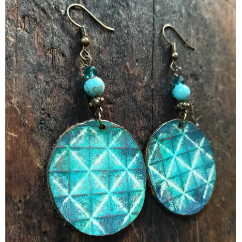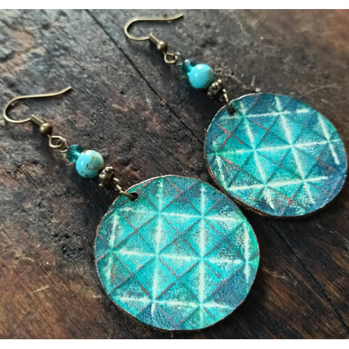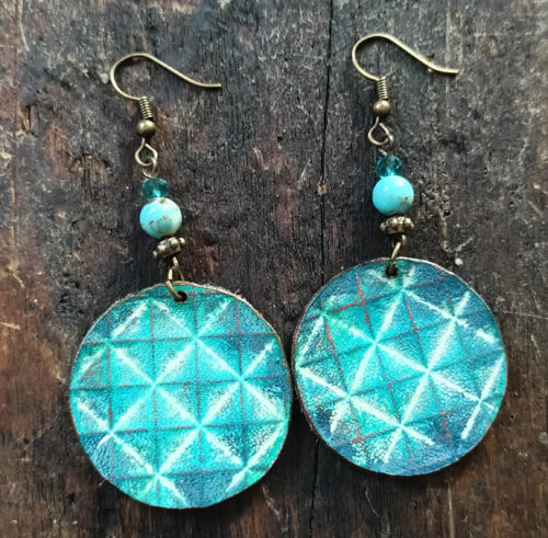 Kézzel festett, valódi bőr fülbevaló, gyönggyel díszítve.