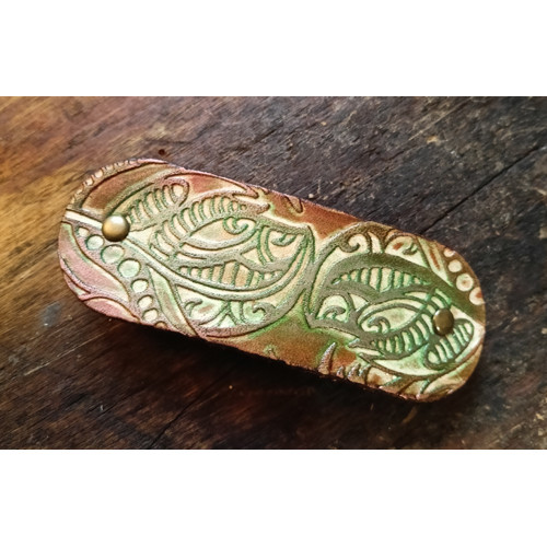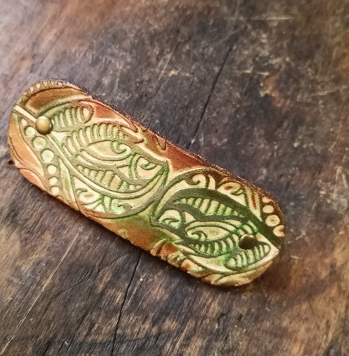 Kézzel festett, domborított mintás, valódi marhabőrből készült hajtű, hajcsat.