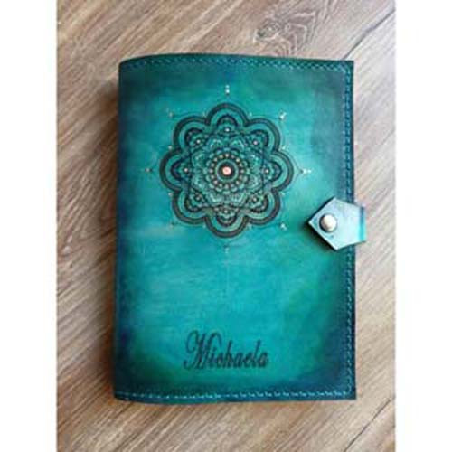 A napló/könyvborítók mindegyike natúr, növényi cserzett marhabőr táblából van kiszabva és egyenként kézzel festve.